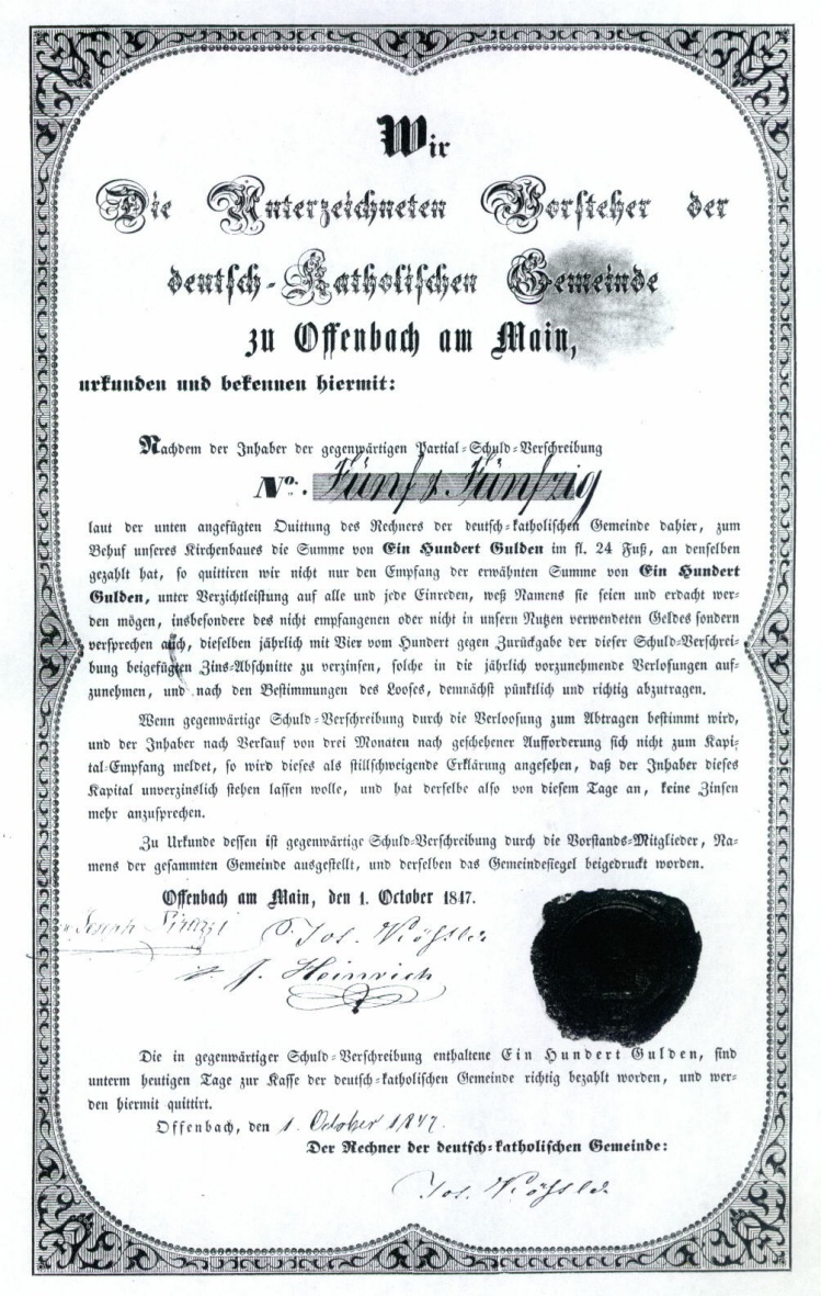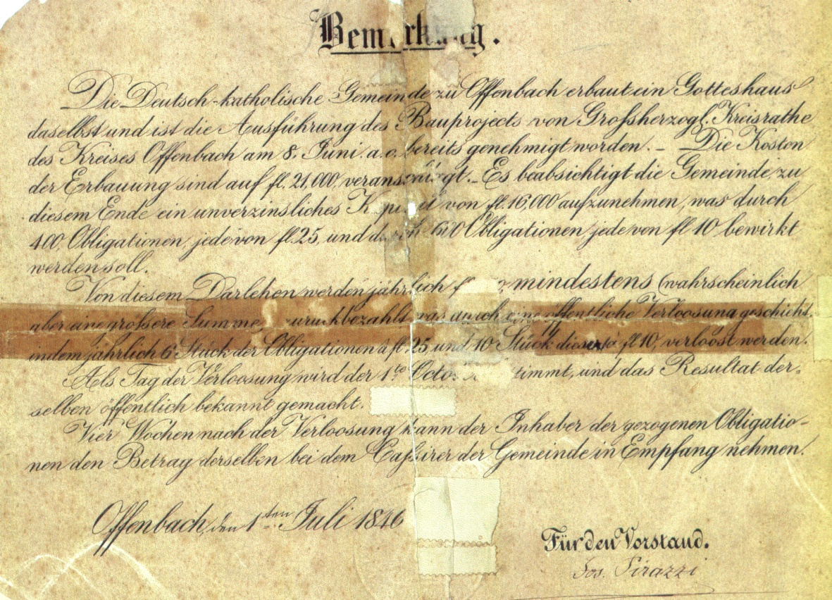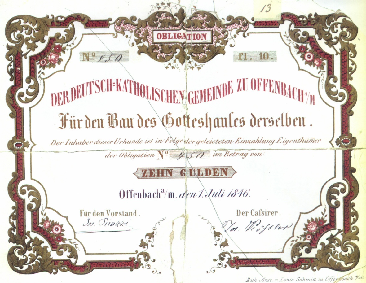 Darlehensobligationen zur Finanzierung des ersten Kirchengebäudes